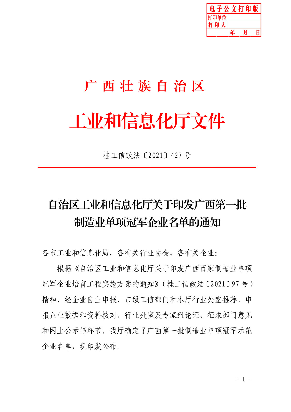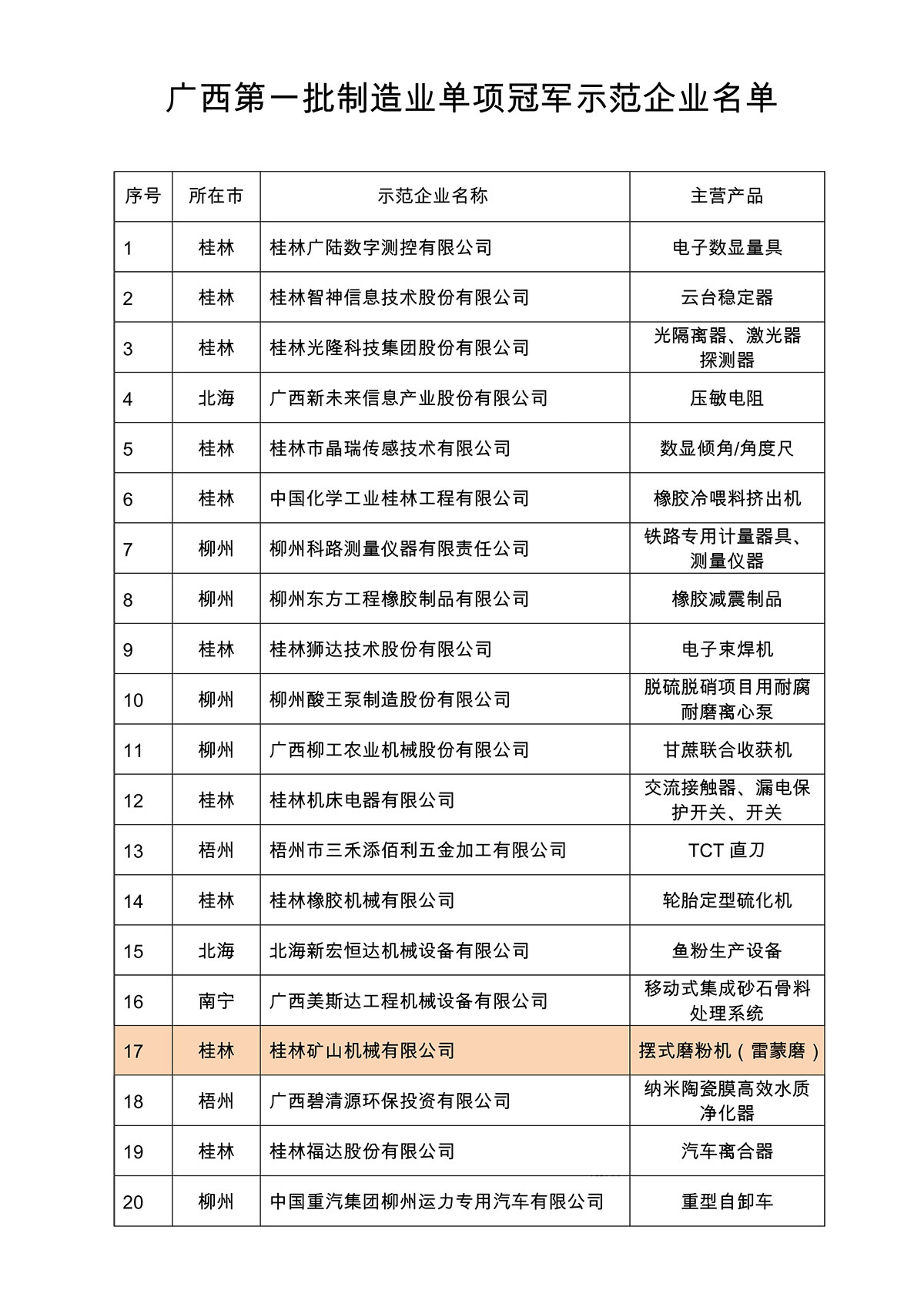 日(rì)前,自治區工(gōng)業和信息化(huà)廳關于印發(fā)廣西第一批(pi)制造業單項(xiàng)冠軍企業名(míng)單的通知,确(que)定了桂林礦(kuàng)機等42家企業(ye)成功入選廣(guang)西第一批制(zhi)造業單項冠(guan)軍示範企業(yè)。