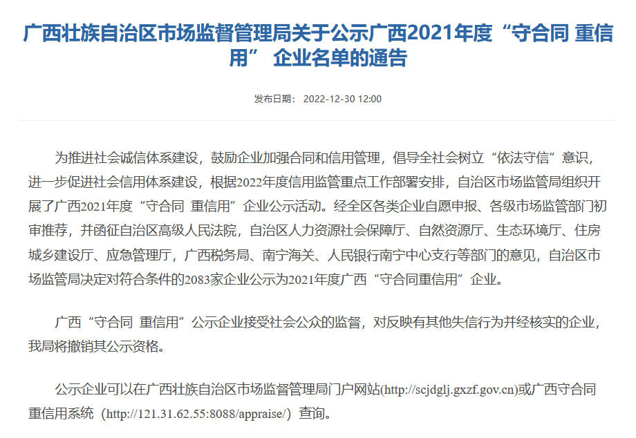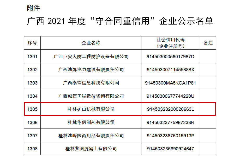 近日,廣西(xi)壯族自治區市(shì)場監督管理局(ju)發布了《關于公(gōng)示廣西2021年度“守(shǒu)合同 重信用”企(qǐ)業名單的通告(gao)》,桂林礦山🥰機械(xiè)⚽有限公司憑借(jie)誠信的經營理(lǐ)念和☂️良好的市(shì)場信⛱️譽等優勢(shi),榮獲㊙️廣西2021年度(dù)“守合同 重信用(yòng)”企業稱号。