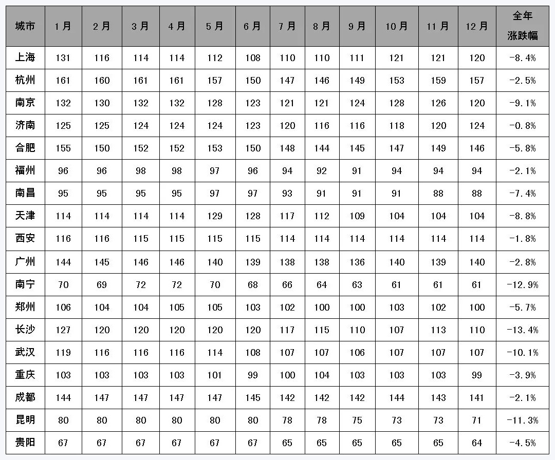 全國重點城市2022年(nián)砂石行情月度變(biàn)化表(元/噸)