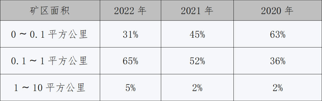 從新設砂石礦(kuang)權礦區面積來看(kàn),砂石行業規模化(huà)水平進一🌈步⭐提升(sheng),礦區面積0.1~1平方公(gōng)裏之間砂石礦權(quan)占新設㊙️砂石礦權(quan)六成以上,成爲新(xīn)設礦權的主流。新(xin)設🛀🏻砂石礦權中,礦(kuàng)區面積在0~0.1平方公(gōng)裏之間的有222宗,占(zhàn)比♋爲31%,占比較🏃2021年下(xià)降14個百分點,新設(shè)小規模砂石礦權(quán)數💚量持續減少;礦(kuàng)區面積在0.1~1平方公(gōng)裏之🐆間的新設砂(shā)石礦權有464宗,占比(bǐ)逐年提升,2022年已經(jing)達到65%;礦區面積在(zai)1~10平🙇♀️方公裏之間的(de)新設砂石礦權33宗(zōng),占比爲5%。